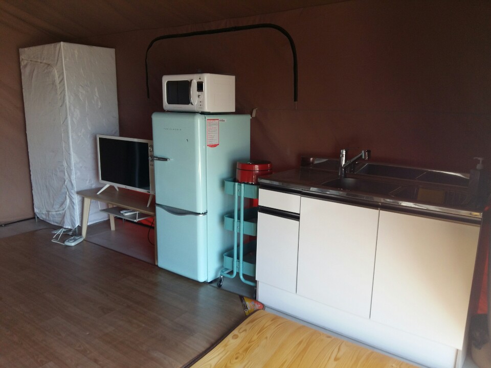 침대, 침대방수커버, 이불셋트, 전기장판, 드라이기, 휴지통 2개, 에어컨, 선풍기, 전기히터, 바닥 전기장판, 소화기, TV, TV 선반, 쇼파, 테이블, 냉장고, 캠핑 테이블, 의자 4개, 6인용 테이블, 3단 수납선반, 멀티탭 1개, 연기 감지기, 화장지, 모기약, 모기향, 버너 , 부탄가스, 호일, 전기밥솥, 코펠( 냄비(소,중,대), 그릇, 종지, 수저, 포크, 젓가락, 수저통, 접시, 가위, 칼, 집게, 국자, 뒤집개, 소주컵 4P, 물컵 4P, 그 외 여분의 그릇과 컵, 내부화장실겸샤워실, 화장실매트, 샴푸, 린스, 바디워시, 치약, 수건 4p, 비누, 일산화탄소감지기, 옷장, 씽크대, 세제, 수세미